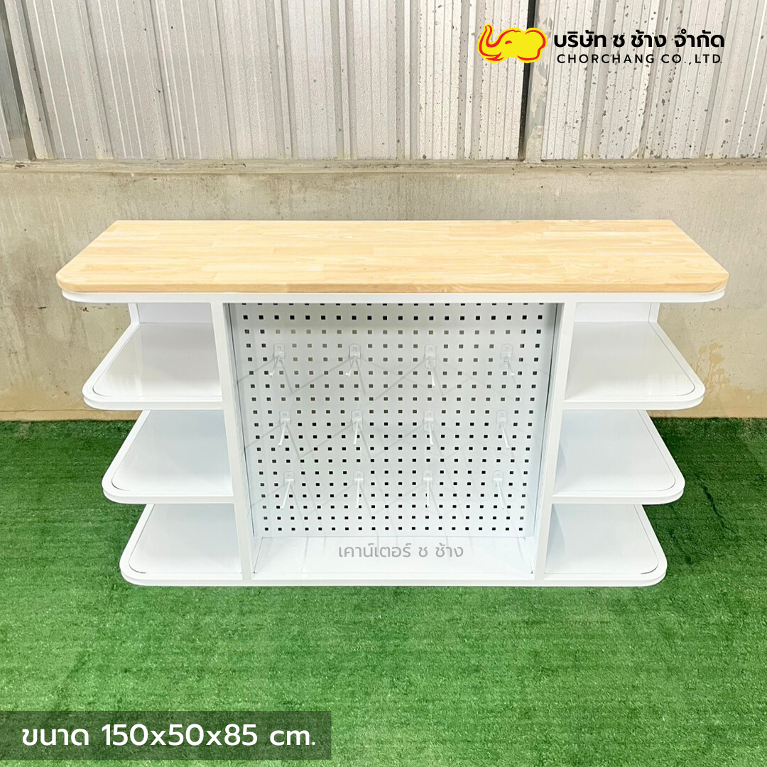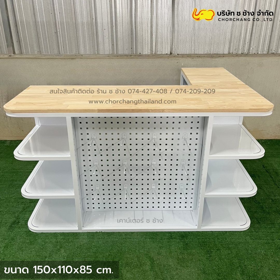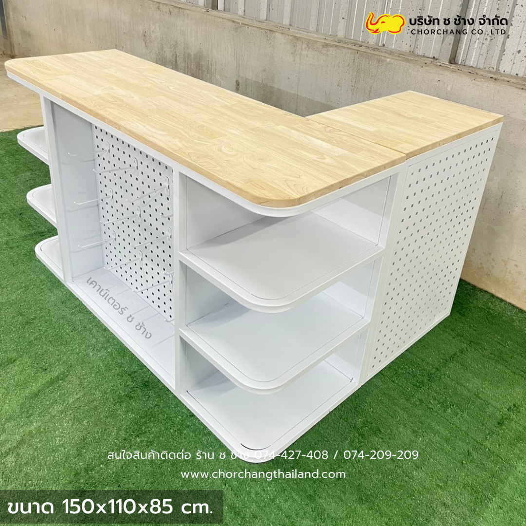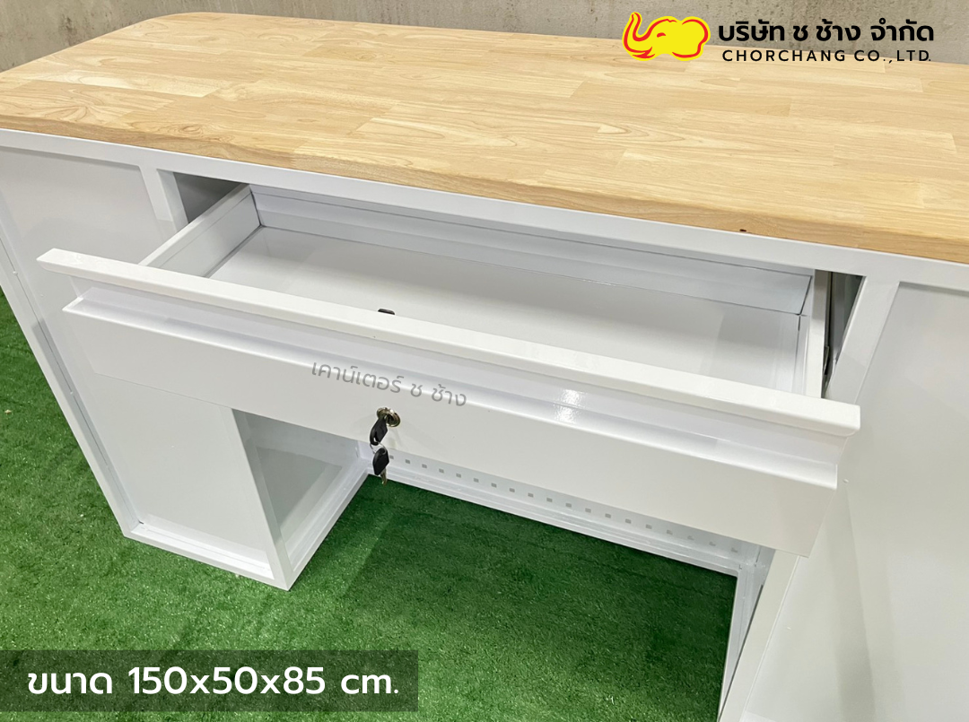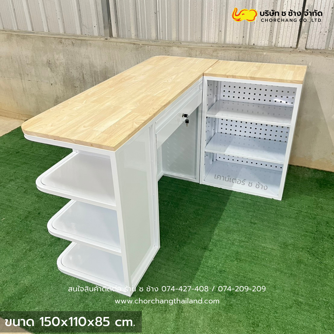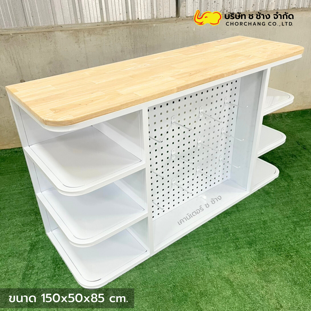 เคาน์เตอร์แคชเชียร์เหล็ก สีขาว ขนาด 1.50 เมตร ท็อปไม้แท้